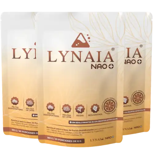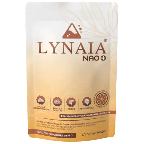 - LYNAIA NAO+ es un alimento funcional elaborado a base de frutas deshidratadas con sabor natural a naranja, enriquecido con ingredientes premium como la melena de león (Hericium erinaceus), triptófano, betaglucanos del Ganoderma lucidum, resveratrol y vitamina B3. La combinación de estos activos está formulada para: